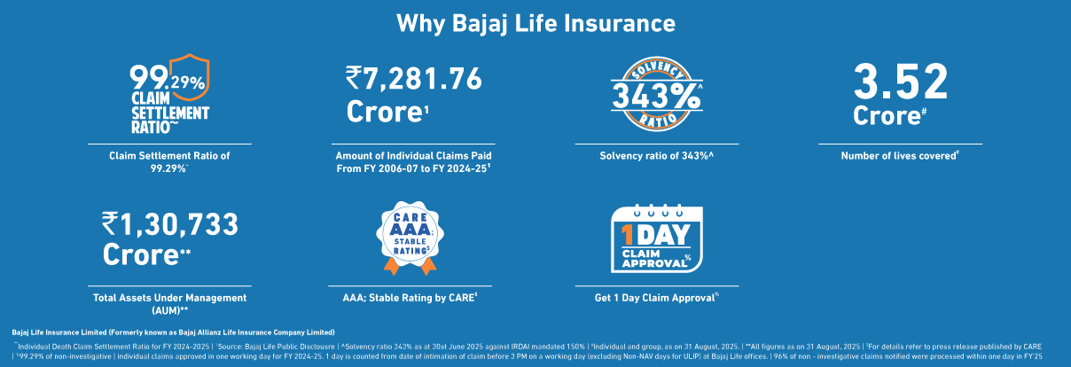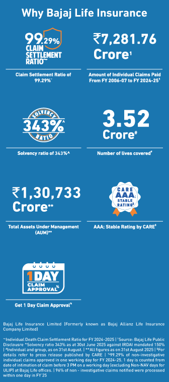 Bajaj Life Insurance Limited, formerly known as Bajaj Allianz Life Insurance Company Limited, is one of India’s fastest-growing private life insurers. Our organisation is transitioning to being 100% owned by the Bajaj Group – a household name in India with a 100-year legacy of trust and credibility. As part of Bajaj Finserv Limited, one of the country’s most diversified and respected financial services groups, we bring innovation, a customer-first mindset, and technology-led solutions to the forefront. Today, we stand as a trusted partner to over 3.85#crore Indians in securing their future.