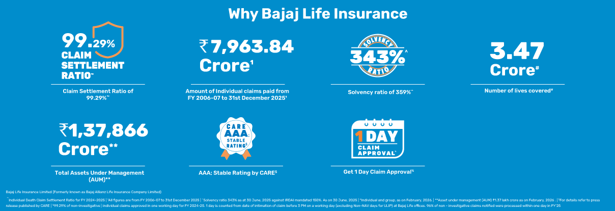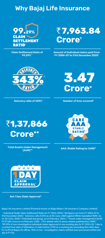 Bajaj Life Insurance Limited, formerly known as Bajaj Allianz Life Insurance Company Limited, is one of India’s fastest-growing private life insurers. Our organisation is transitioning to being 100% owned by the Bajaj Group – a household name in India with a 100-year legacy of trust and credibility. As part of Bajaj Finserv Limited, one of the country’s most diversified and respected financial services groups, we bring innovation, a customer-first mindset, and technology-led solutions to the forefront. Today, we stand as a trusted partner to over 3.85#crore Indians in securing their future.